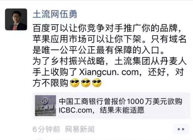 那么,买下“乡村”域名的土流集团,又是什么来历呢?据查询发现,土流网原来是一家农业土地流转资讯类网站,将掌握闲置土地的农民、土地流转中介机构、土地种植企业三者联系到一起,实现了土地资源的流转和优化配置。土流网用的域名是tuliu.com,也是一个标准的双拼域名,看来该公司老板在域名策略这块是非常重视的,在收购xiangcun.com成功之后,伍勇立马发布了朋友圈,表达了他的欣喜之情和对这枚域名的肯定,并强调说:百度可以让你的品牌为竞争对手带去流量,苹果应用市场可以让你的应用下架,只有域名是唯一公平公正最有保障的入口。诚如伍勇所言,域名是最公正、公平的入口。在百度上,如果竞争对手将自己企业的品牌词购买后,做了竞价推广。当网民搜索自己的企业品牌名称时,首先弹出的就是对手购买的百度竞价推广信息。这对自己的企业品牌、用户流量、用户转化各方面都是一个巨大的打击。而在苹果方面,也没有公正可言。苹果官方曾表示,“为了确保提供最优秀的App和游戏,同时也为了保障用户的安全,App Store会评估并移除不能在App Store上发挥作用、年代久远或是不符合审核规定的App。”这就意味着只要苹果方面动动手指,你的App就随时有可能被下架。如果使用域名的话,就没有这方面的烦恼。域名具有唯一性,世界上不存在两个相同的域名。所以,尽管竞争对手可以抄袭你的品牌名,购买一样的关键词,但他无法复制你的域名,无法阻止用户使用域名这个入口找到你。此外,域名是企业的重要资产,只要一直续费,就相当于永久持有,主动权掌握在自己手中,不用担心被下架。域名是互联网的重要入口,一个企业尤其是互联网企业要想长远发展,不受制于搜索引擎和APP应用市场,必须要有自己的独立网站和最适合自己的域名。