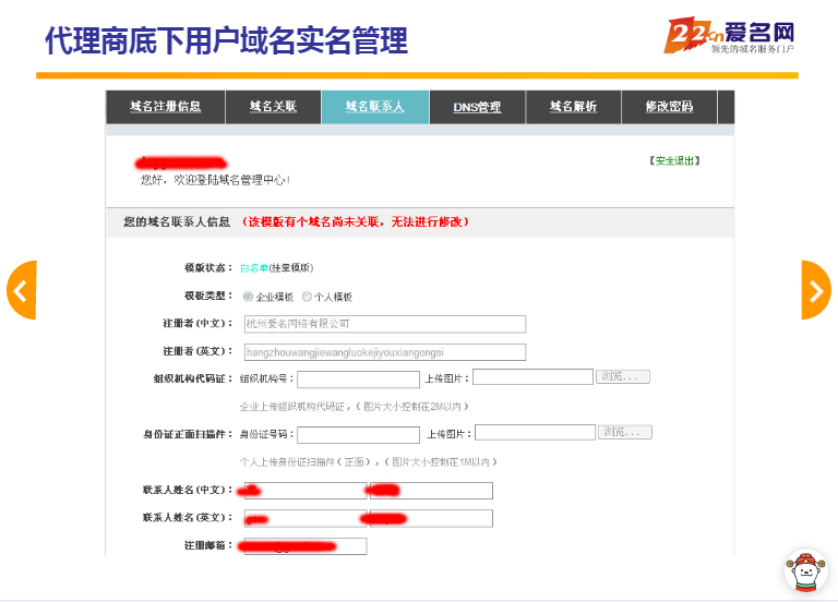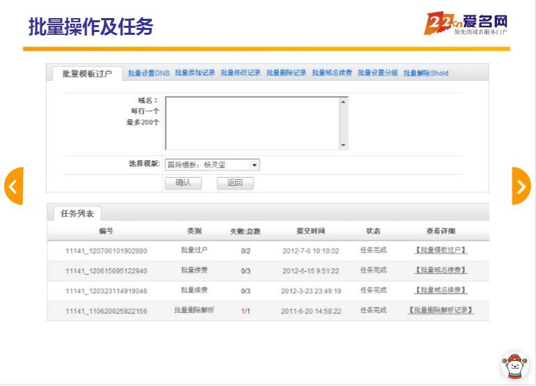 中国互联网经过多年的发展,域名需求随着网民数量增加而日益增大。根据2012年6月份数据显示,美国平均4人就拥有1个域名,而中国大约是150人才拥有1个域名,域名需求巨大,进而域名市场的机会也显而易见。爱名网就是顺应这个域名市场的大潮流应运而生。爱名网成立于2008年,专注于域名增值服务及注册商级技术支持服务。2009年开启域名注册业务,目前自有及代管有百万级的域名。究竟是什么促使这家年轻的企业进步如此迅速呢?这和其理念,经验和功能特点息息相关。注册商系统平台只是一个对业务支撑的工具,对注册商而言不是核心,然而如果这个系统能够高效运作,能够让用户安全、简单、便捷地使用,能够为注册商节省人力,节省时间,创造出更大的价值,那么才可以称这个系统为一个优秀的工具。爱名网平台系统正是由此而开发和完善的。在域名行业摸爬滚打多年,爱名网具有足够的经验。爱名网系统平台经过多年的完善,保持着与CNNIC,Verisign注册局的紧密联系,时刻掌握最新政策,及时调整域名注册管理流程,具有领先的业务逻辑和宝贵经验。爱名网经历过1元cn域名时代,因此具有管理大量域名的经验。爱名网经历过2009年底cn域名风波,由于爱名网系统平台具有先进的模板概念,在短短2个月内完成了大部分注册商需要1年才能完成的域名实名工作。在代理商平台里,爱名网有一个域名管理中心,可以让代理商的用户在系统里面直接上传证件,管理域名信息。因此,爱名网一直保持着非常高的域名实名率。便捷而且多样化的功能是一个成功的系统平台不可或缺的因素。爱名网系统平台具有的功能特点深受广大用户喜爱,既方便了用户,也提升了平台的运行效率。1.友好的交互界面2.会员间转移域名,支持代价PUSH3.域名转入转出功能,在线获取转移密码4.模板机制,在线过户5.手机短信和邮件验证功能6.域名实名认证功能,可在线提交域名认证资料,ID5认证7.支持批量功能,域名批量查询、批量注册、批量续费、批量修改等8.标签功能,域名查询时,可以按各种关键字查询相关域名9.可以注册管理DNS服务器10.完善的API接口腾讯成功了,他们有QQ.com;YY成功了,他们有YY.com;百度成功了,他们有baidu.com;谷歌成功了,他们有google.com……如果这些网站丢了域名,会发生什么?公司可能一夜之间倒闭,这绝对不是危言耸听。如果把网站比喻成一座宫殿,那么域名就是这个宫殿的地皮,是基础,其作用自然不可小觑。爱名网专业做域名,解决用户需求、节省用户成本、节省用户时间、服务可靠安全、易用性强。爱名网,值得信赖!