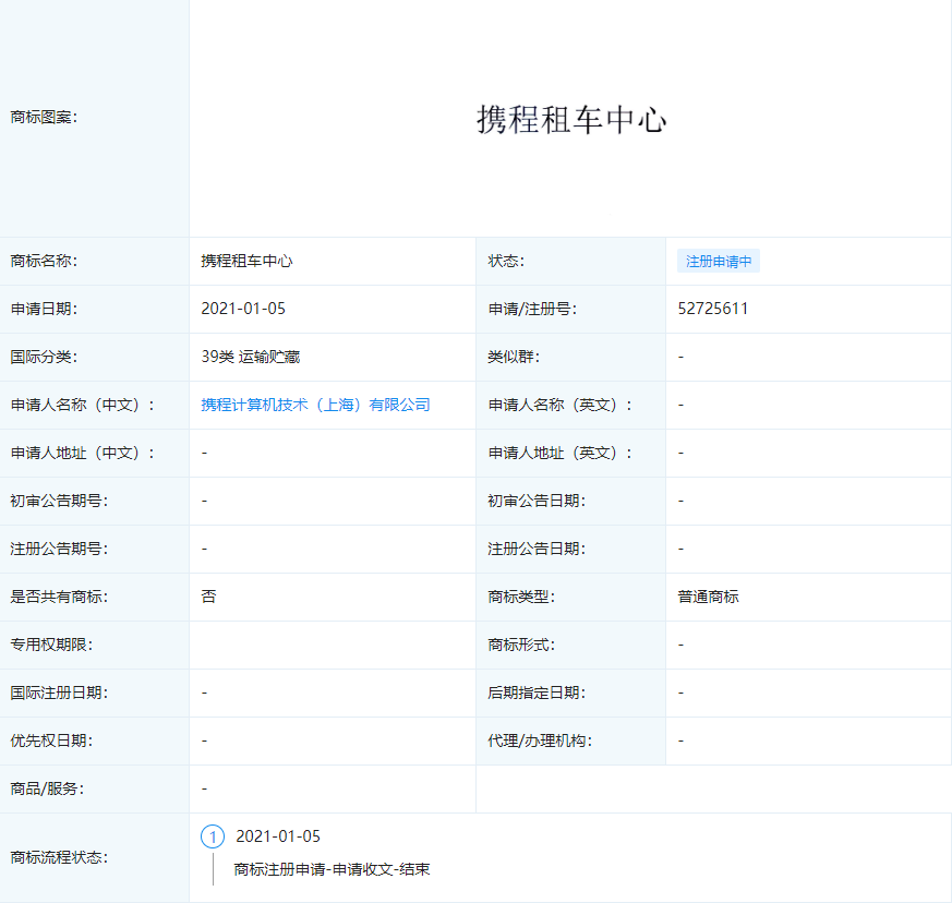 企查查显示,携程计算机技术(上海)有限公司于近日申请注册“携程租车中心”商标,申请日期为2021年1月5日,商标状态为“商标申请中”。