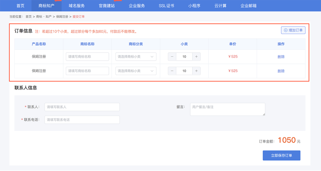 商标保姆注册下单页可点击“增加订单”按钮实现多订单下单,如下图所示: