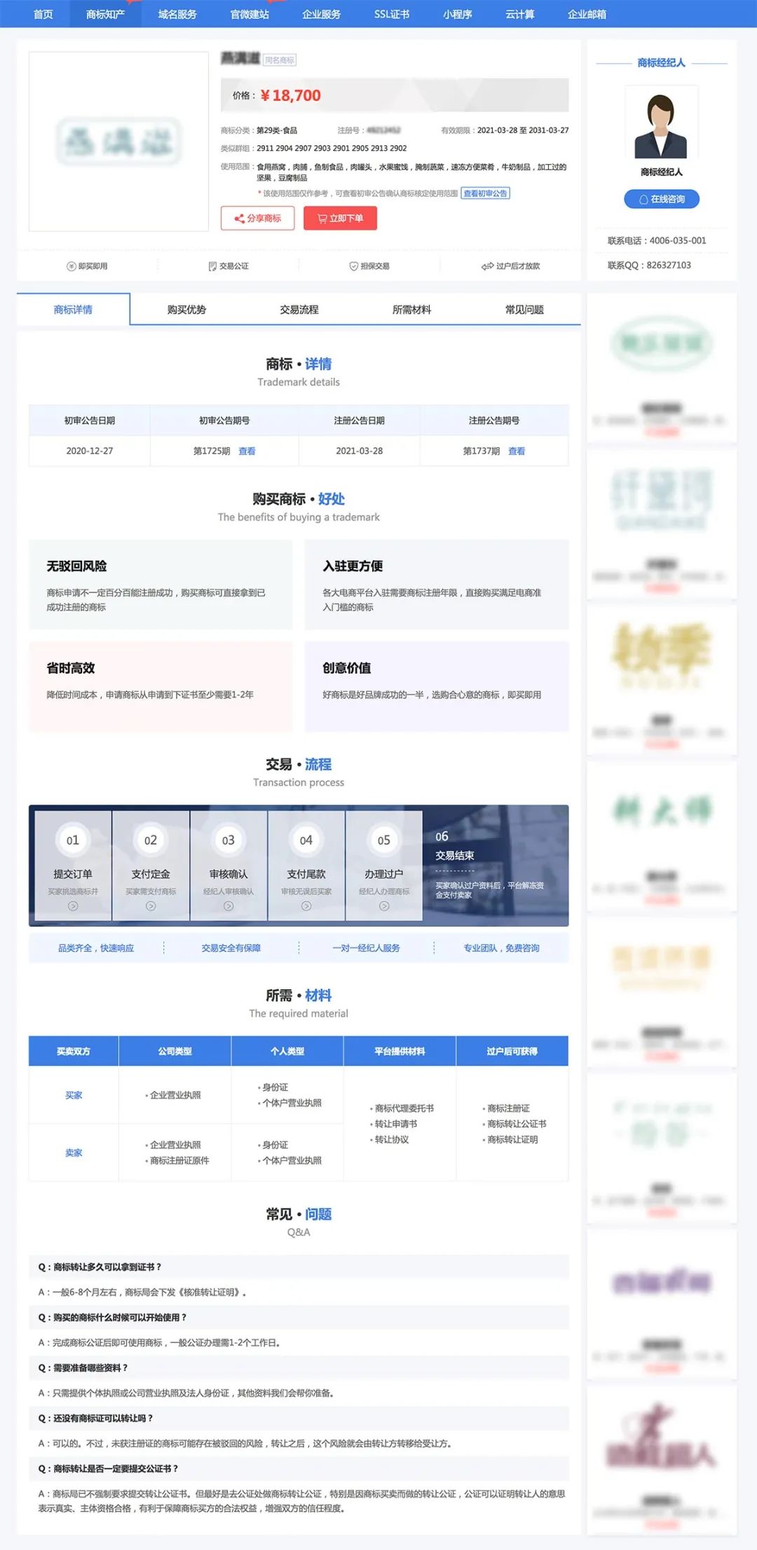 商标交易商标详情页样式调整、内容优化,如下图所示: