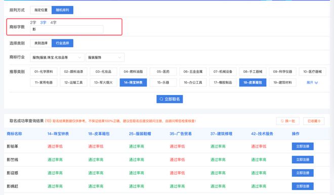 商标取名最好和品牌相结合,以原创为主,具有自己的特色,在日后宣传中也更为有利。如果取名没有灵感,可使用商标智能取名工具辅助取名,可输入商标名称的一部分字,可自动生成商标名称,并且提示商标分类注册改名字的通过率高低。