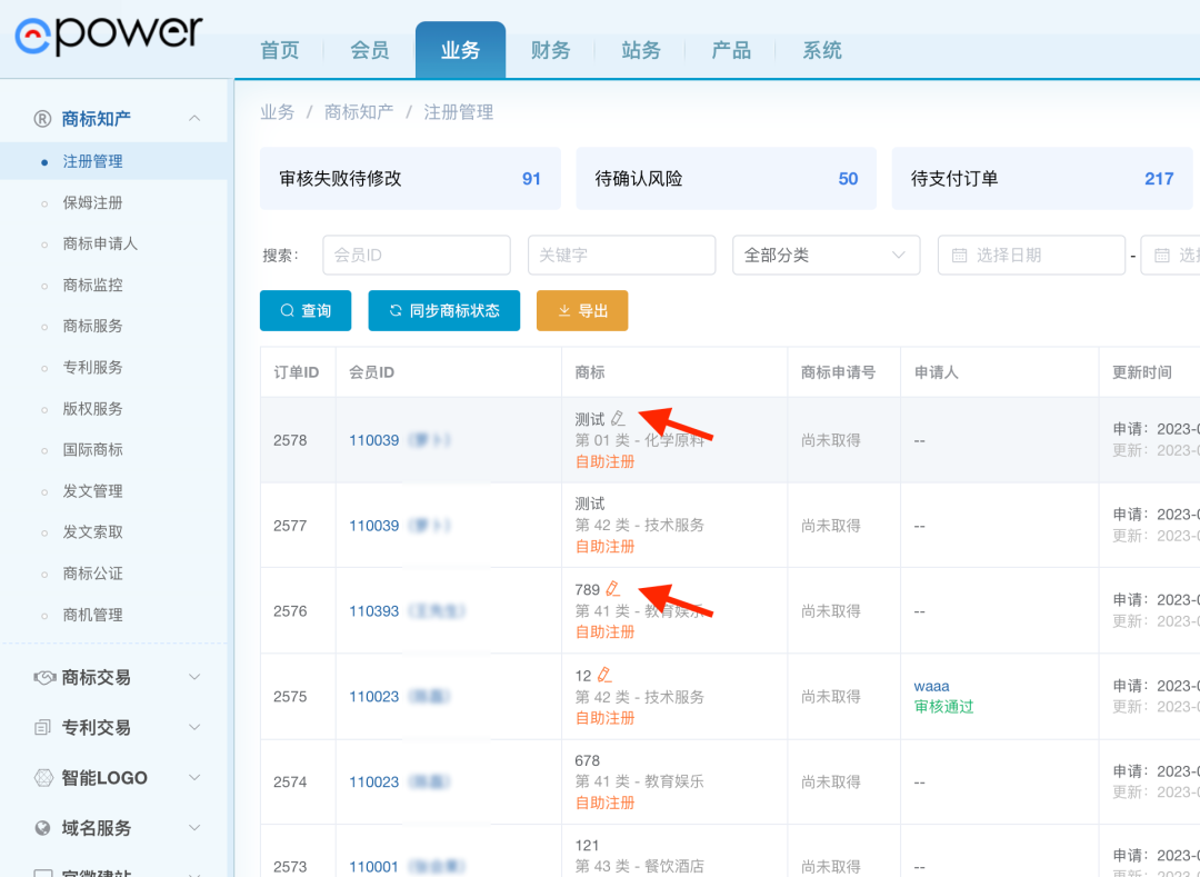 商标注册订单列表增加备注功能,鼠标移入,点击图标,输入备注信息即可,方便管理员对订单的管理。