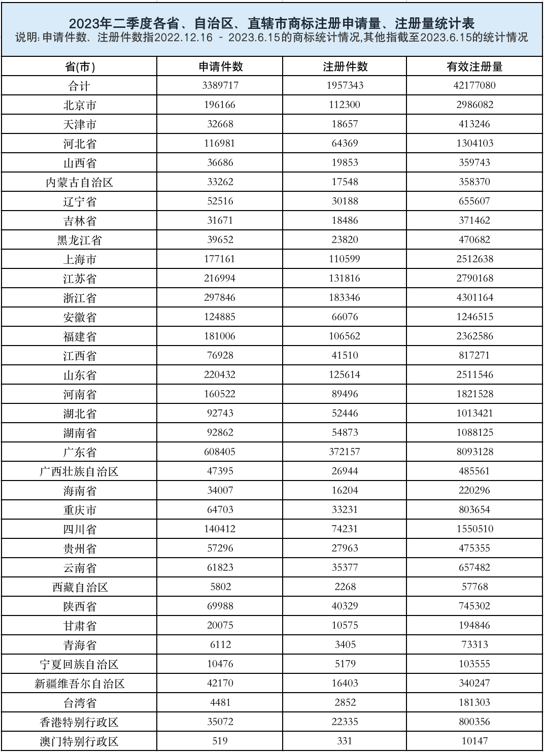 根据统计表数据显示,2023年二季度(2022.12.16—2023.6.15)全国商标申请量达3,389,717件,注册量达1,957,343件。截至2023年6月15日,我国有效商标注册量为42,177,080件!