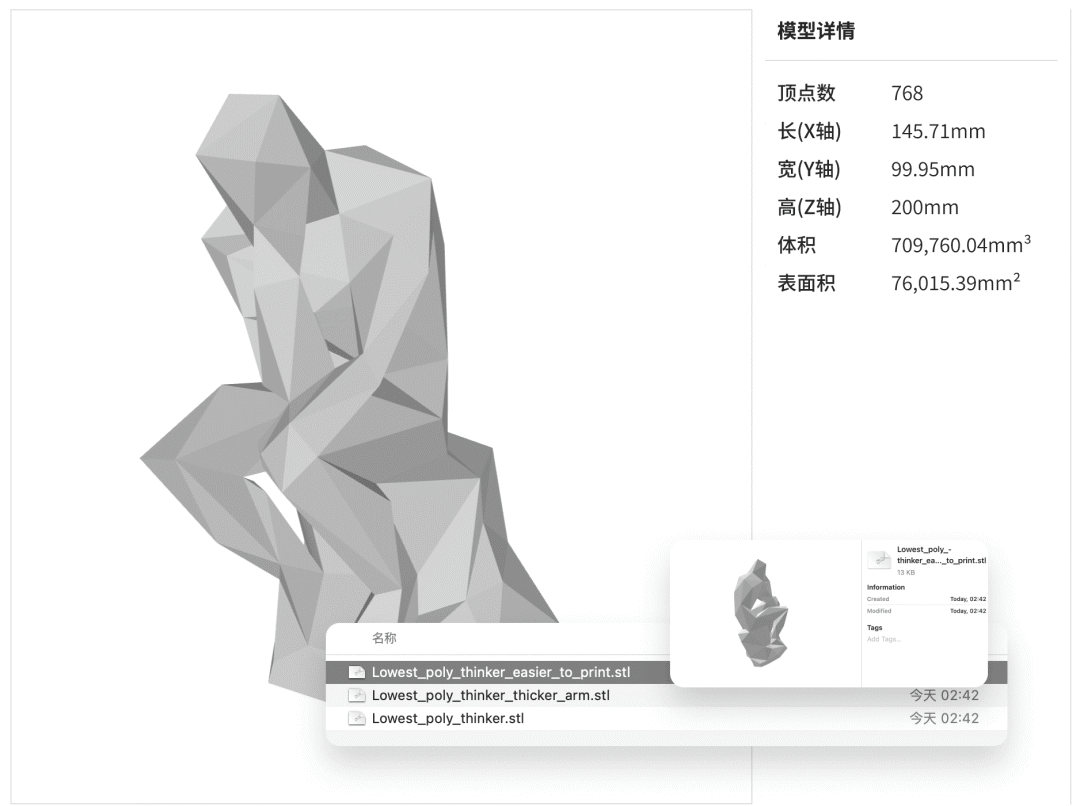 该功能组件支持解析常见的3D模型格式(3dm, 3ds, 3mf, amf, bim, brep, dae, fbx, fcstd, gltf, ifc, iges, step, stl, obj, off, ply, wrl 等),可以解析模型的长、宽、高,顶点数、实际体积、表面积等参数。