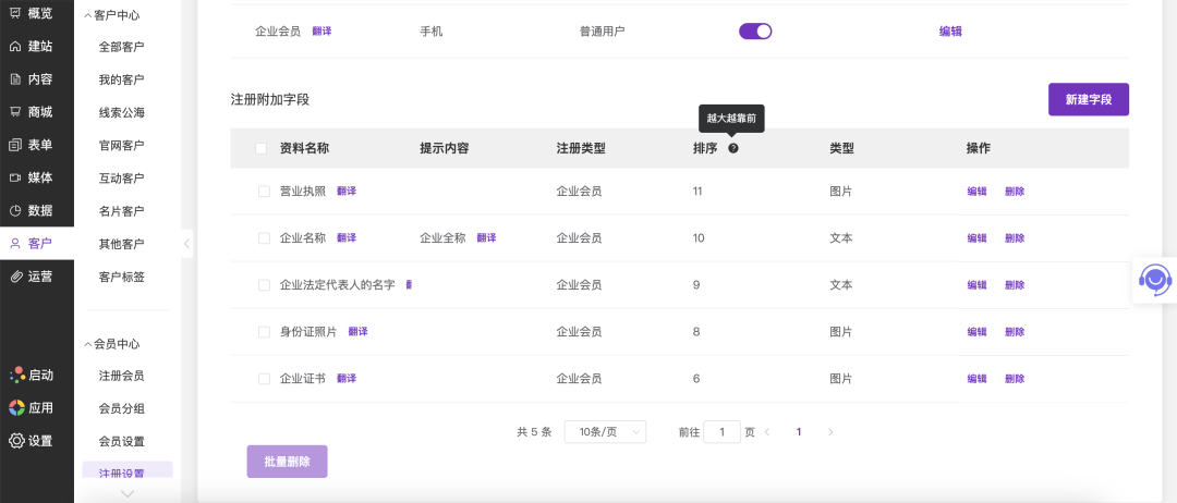 4、 注册会员自定义字段可排序;
