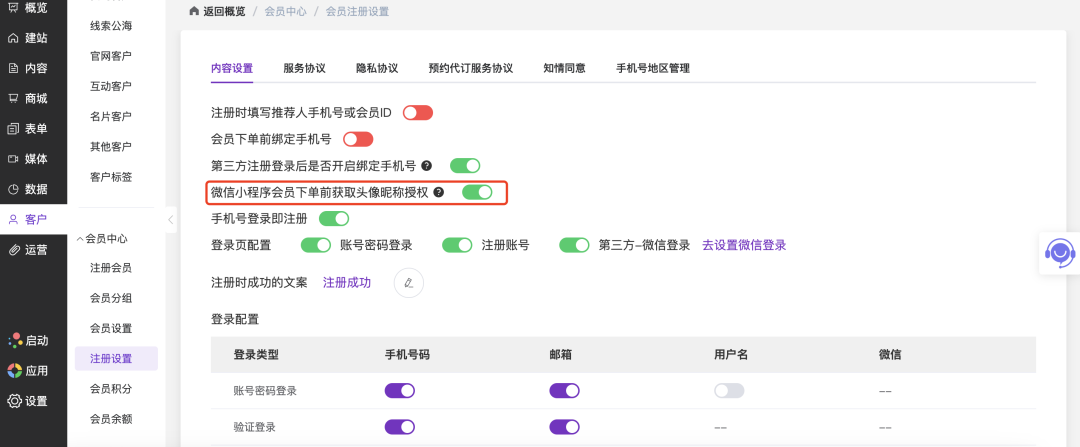 操作路径:官微中心 - 客户 - 注册设置