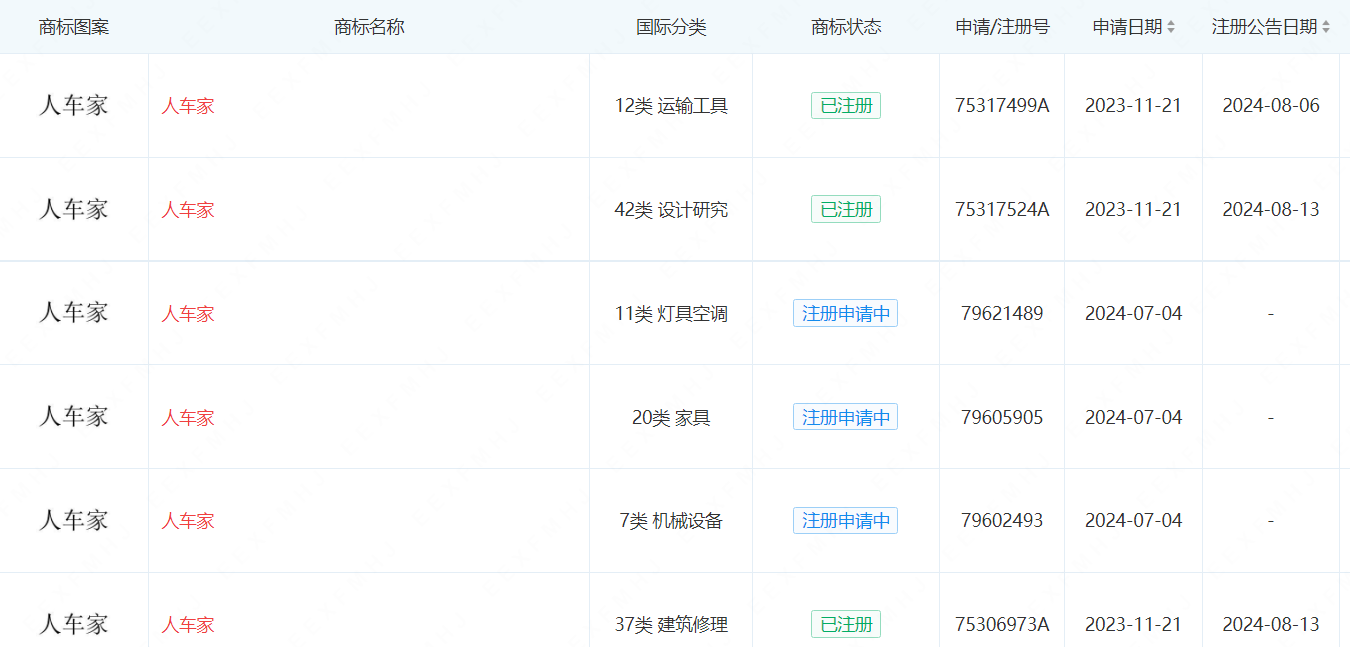 5.小米科技有限责任公司近期提交一件“人车家”商标,类别是第28类-健身器材。据查,小米早先已成功注册多件“人车家”商标。