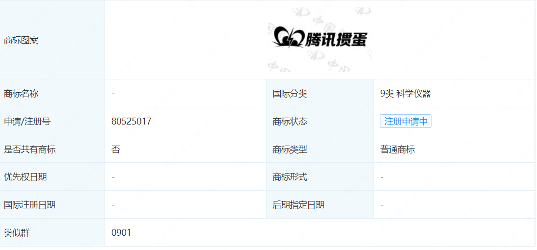 4.近日,腾讯科技(深圳)有限公司提交申请一件“腾讯掼蛋”商标,指定在第9类-科学仪器,商标正在申请中。