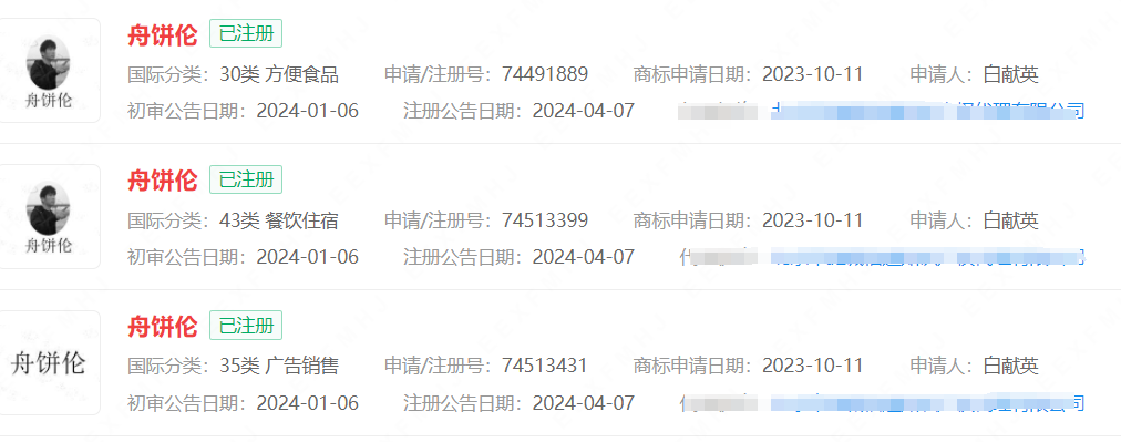 经查,白献英名下申请注册了“周饼伦”“粥饼伦”“舟饼伦”“粥饼轮”文字及肖像商标,大多数已成功注册。