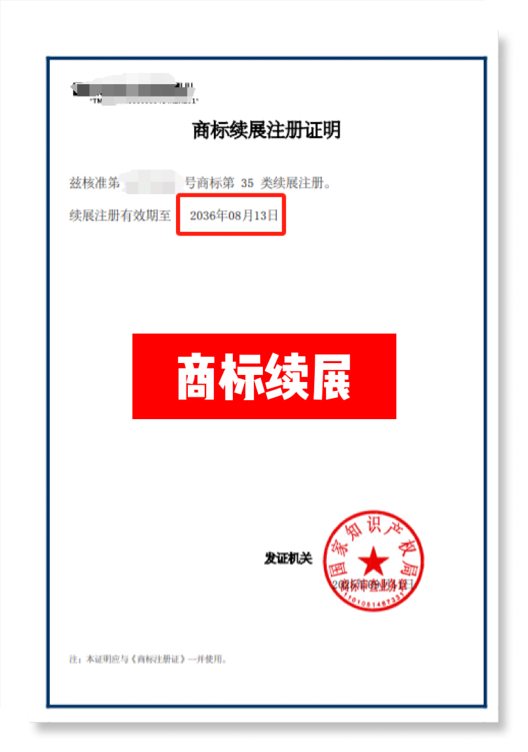 比如上图这件商标,原本将于2026年8月13日到期,通过办理续展,延长至2036年8月13日。大家可以查看一下自己的商标注册证,上面有商标到期时间哦,在到期前1年内就可以办理续展。