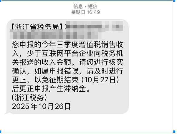 10月26日,众多淘宝、亚马逊、速卖通卖家几乎同时收到来自税务局的“补税提醒”短信,短信明确指出纳税人申报的三季度增值税销售收入,低于互联网平台向税务机关报送的金额。