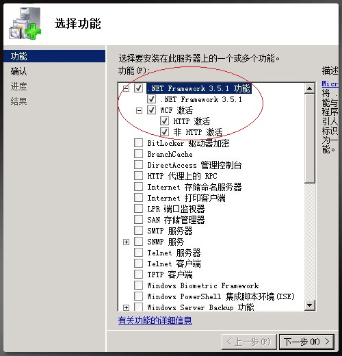 点击功能->"添加功能"->勾选“.NET Framework 3.5.1功能”,如下图