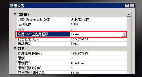 添加完成后,右键点击创建的php进程池->高级设置,设置“启动32位应用程序”为“true”,否则会报错:“HTTP 错误 404.17 - Not Found”
