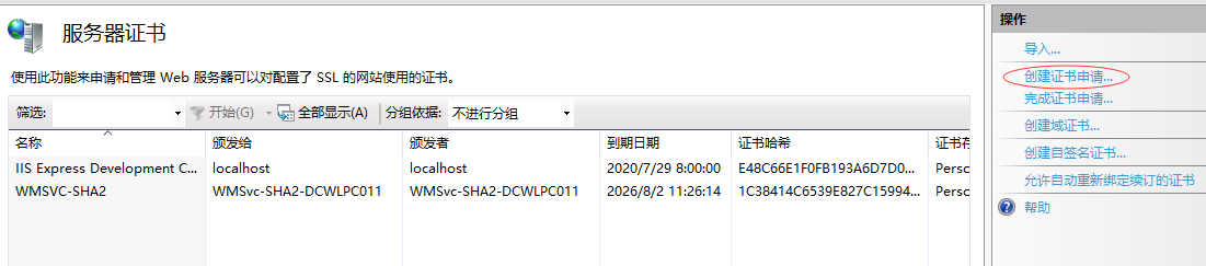 1.1、打开IIS,选中左侧根节点,在右侧”功能视图“中,打开“服务器证书”,在最右侧的“操作”窗口,点击“创建证书申请...”,如下图所示: