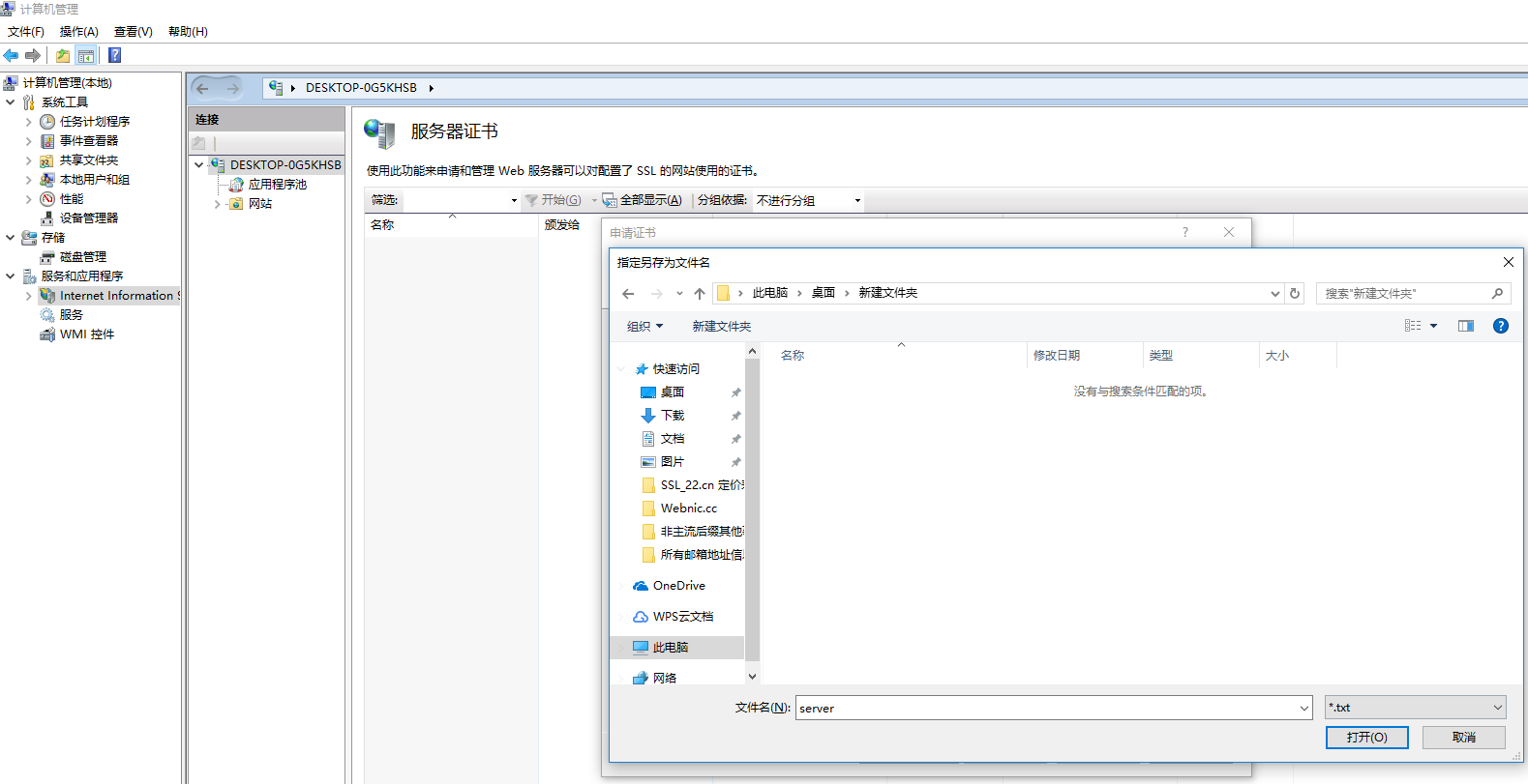命名一个名称server.txt的文件,导出CSR文件,该CSR文件将用于权威颁发机构证书申请。