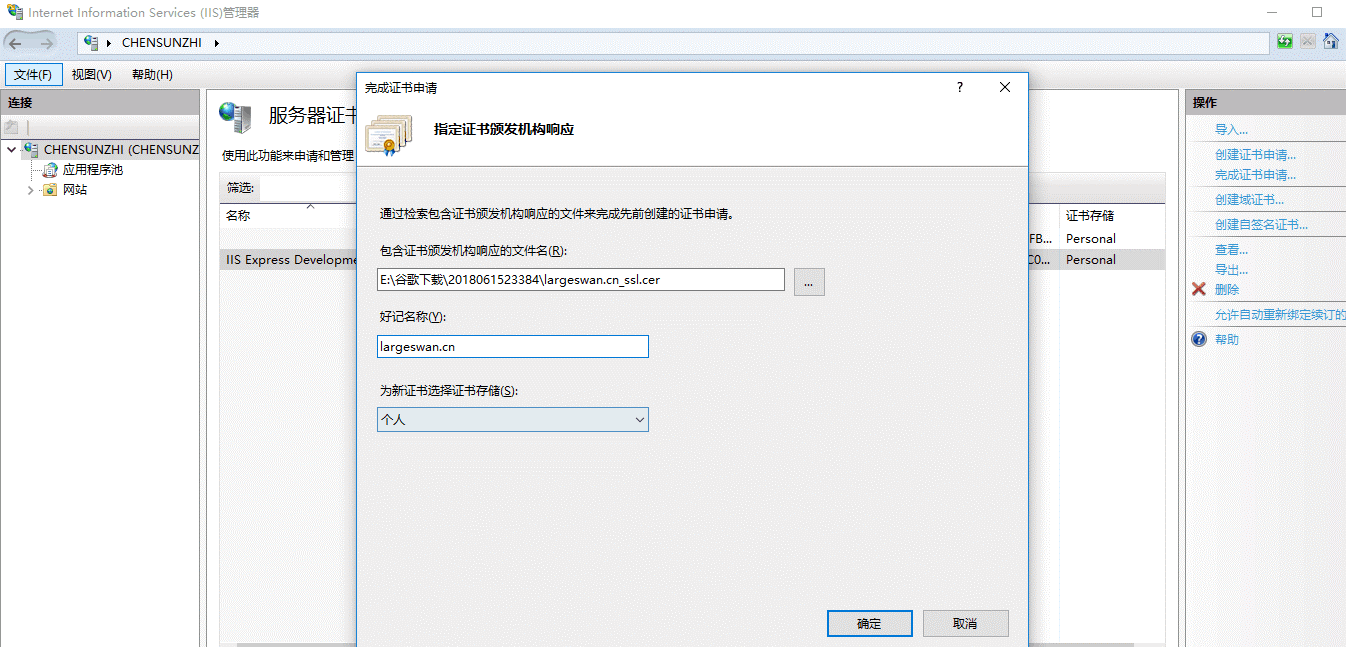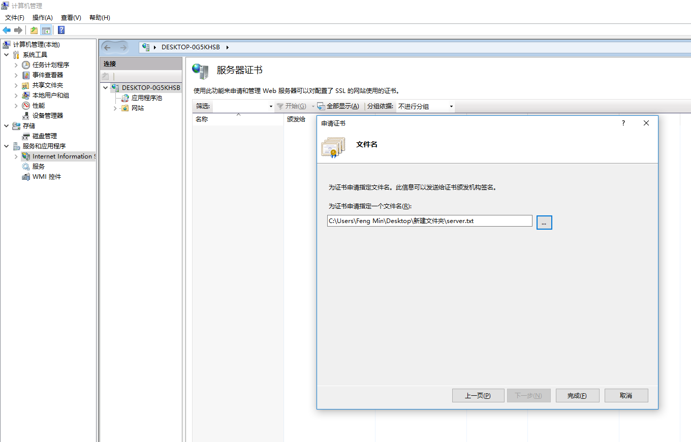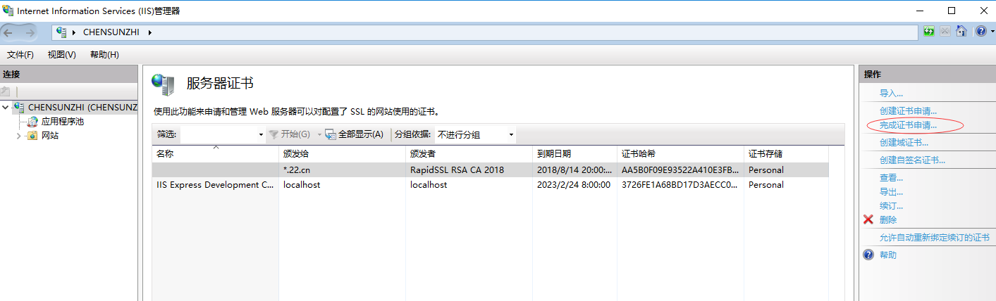 作”窗口,点击”完成证书申请...”,如下图所示: