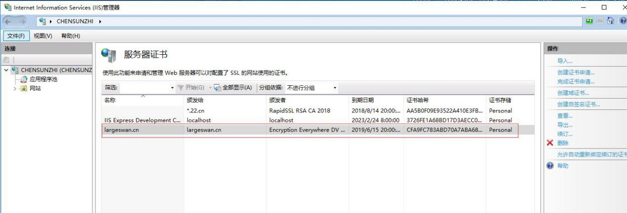 导入使用(在IIS中,选中左侧根节点,在右侧”功能视图“中,打开“服务器证书”,在最右侧