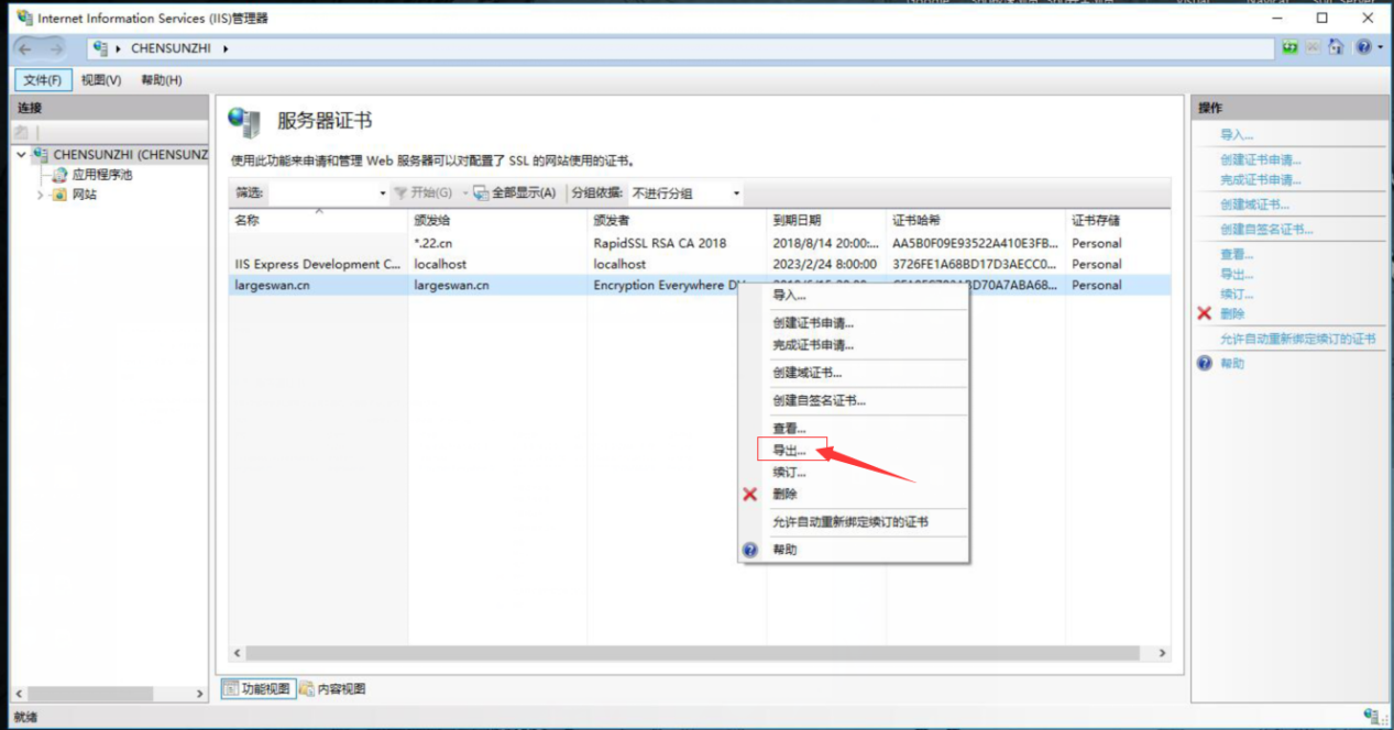 4.1第一种方法,直接导出pfx文件:如您没有下图的“导出”的选项,说明您导入的.cer证书文件与您当时生成CSR不是同一台服务器,所以请您务必将签发成功的.cer证书文件导入到当时生成CSR一致的服务器中。