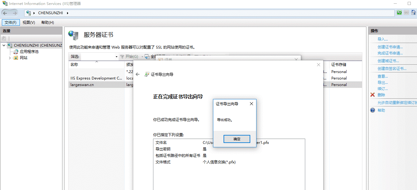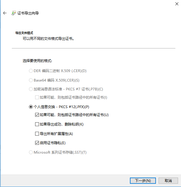 使用证书导出功能之后,导出证书为pfx格式,如下图所示: