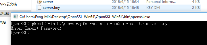 用openssl 工具 从pfx中提取key,输入以下命令,如下图所示: