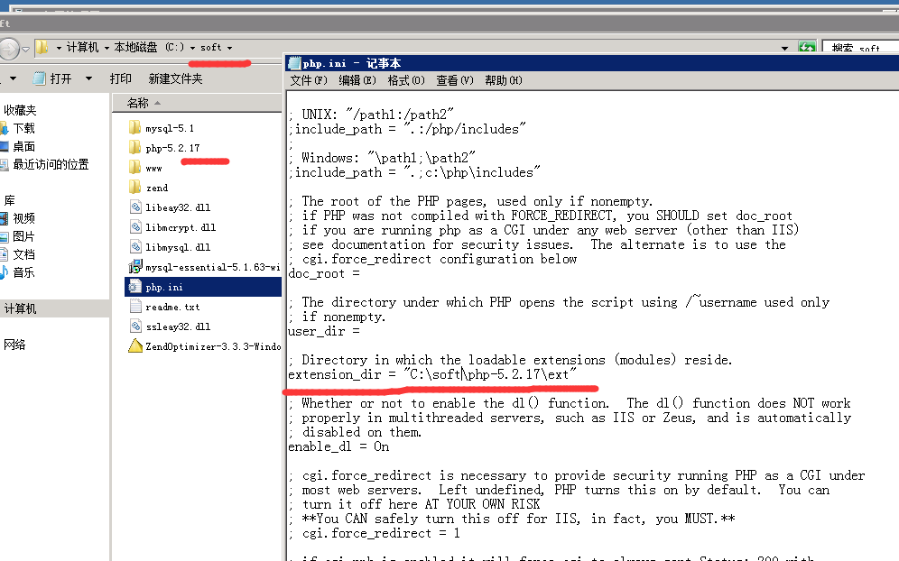 打开解压文件中的 php.ini 文件 找到 并把extension_dir "./"改为extension_dir = "C:\soft\php-5.2.17\ext "