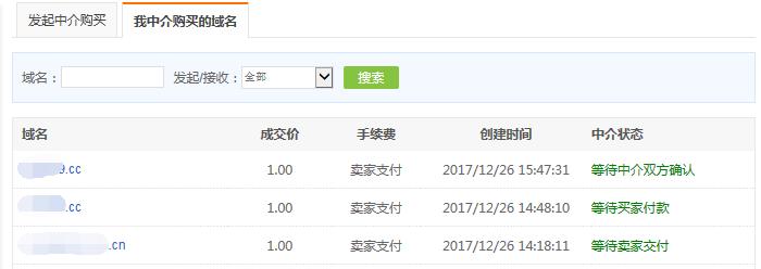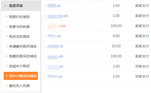 登录会员中心后左侧菜单 我是卖家—我中介购买的域名 查看