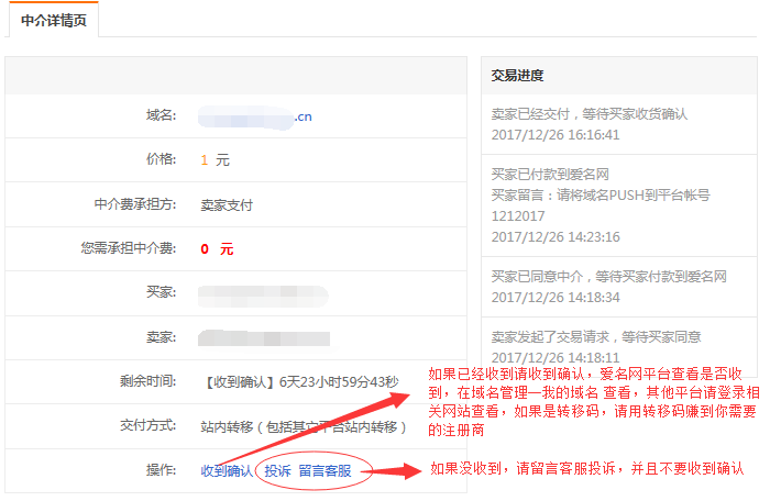 当卖家更改发货状态后,买家需要确认收货。如果卖家已经发货,而买家如果没收到,买家可以留言客服投诉。如何查看是否收到域名。如果域名是爱名网平台,请在域名管理->我的域名查看,其它平台请登录相关网站查看,如果交付方式是密码转移方式,卖家则提供转移码,买家只需要用转移码转移到需要的注册商即可。