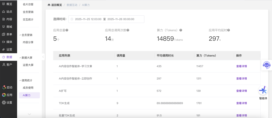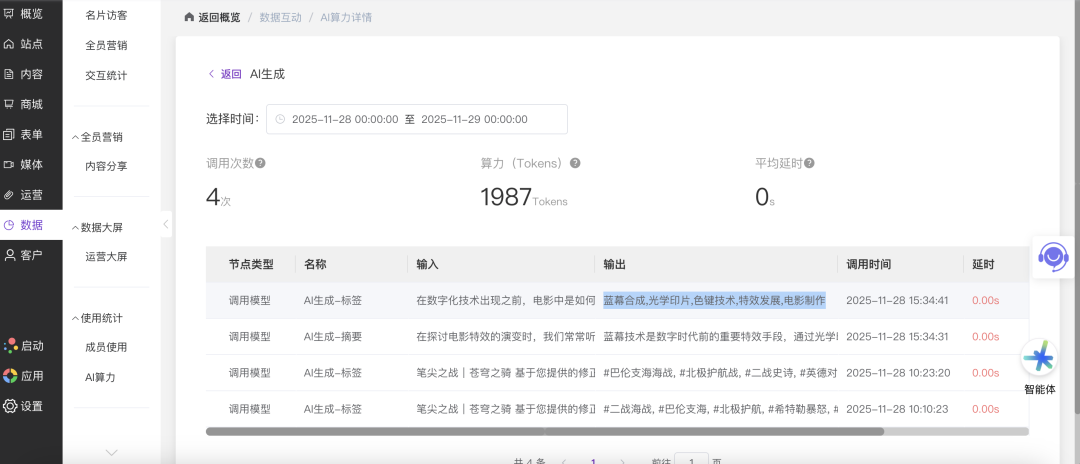 可以查看在营销枢纽中调用AI能力时,AI算力(token)的使用情况。操作路径:营销枢纽 - 数据 - 使用统计 - AI算力可以看到每个AI应用的具体调用次数、时长和token消耗:点击查看详情,可以看到这个应用下,每次调用的输入输出内容与具体的消耗:
