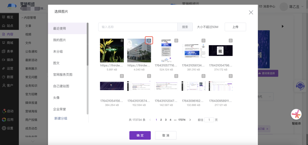 请将证书内容(包含证书链)复制粘贴到此处。即证书内容含有2个或3个-----BEGIN CERTIFICATE-----区隔符的文件。为了方便找到一些特定的图片素材,本次升级对素材管理页面的图片类型也增加了搜索功能。找到下图红框内的搜索框,输入关键字按照素材的文件名进行筛选:另外,图片素材库选择弹窗,也增加了快捷删除功能。可以在弹窗中将不需要的图片进行删除。如下图红框内所示:- 弹出订阅二维码: 每次订阅按钮被触发并弹出二维码。