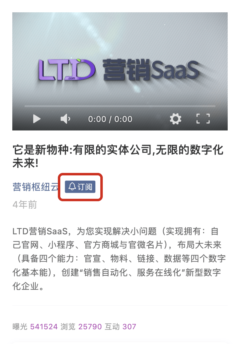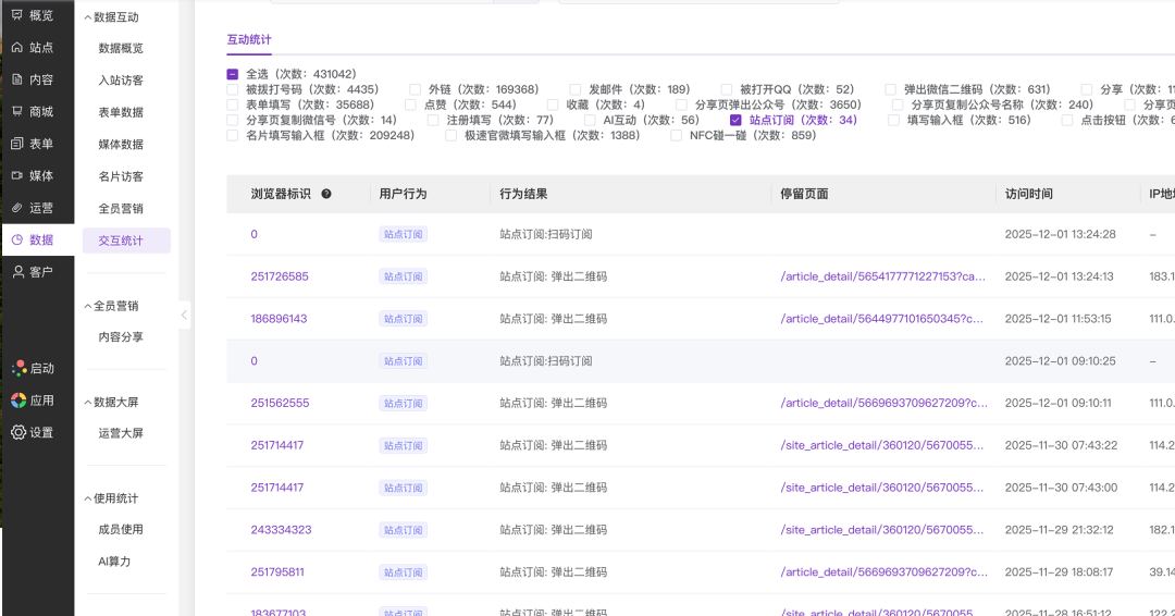 可以通过 官微中心 - 数据 - 交互统计,选择 "站点订阅" 类型来查看所有交互事件为了让订阅入口可以更加灵活地集成到网页内,本次升级我们对网站编辑器里面也增加了一个"弹出订阅二维码"的动作事件。比如下图中我们将一个文本组件的"跳转"事件设置为"站点订阅",保存并发布后,用户点击页面上的这个文字,即可弹出订阅二维码:用户关注公众号订阅成功后,公众号推送消息也做了一些简化。视频类型的移动分享页,本次升级后也增加了订阅入口,如下图红框内所示:03