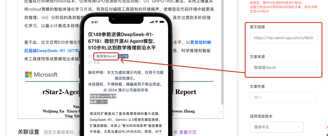 本次升级我们为移动分享页里的"来源"字段添加了链接。下图移动分享页的红框内为文章编辑中的"文章来源"里设置的内容,本次升级后,如果文章的"原文链接"中设置了链接,点击分享页的来源就会自动跳转到这个原文链接上。05