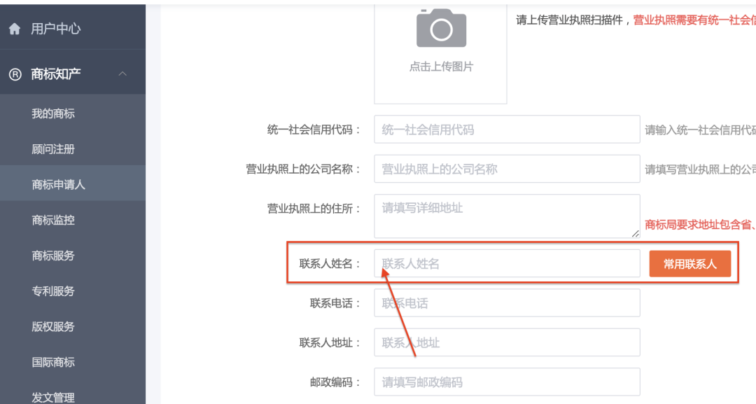 在用户控制后台“商标知产—商标申请人—个人申请”处,联系人姓名栏增加2个字符以上限制规则。当用户填写不正确时,系统将提醒用户修改。