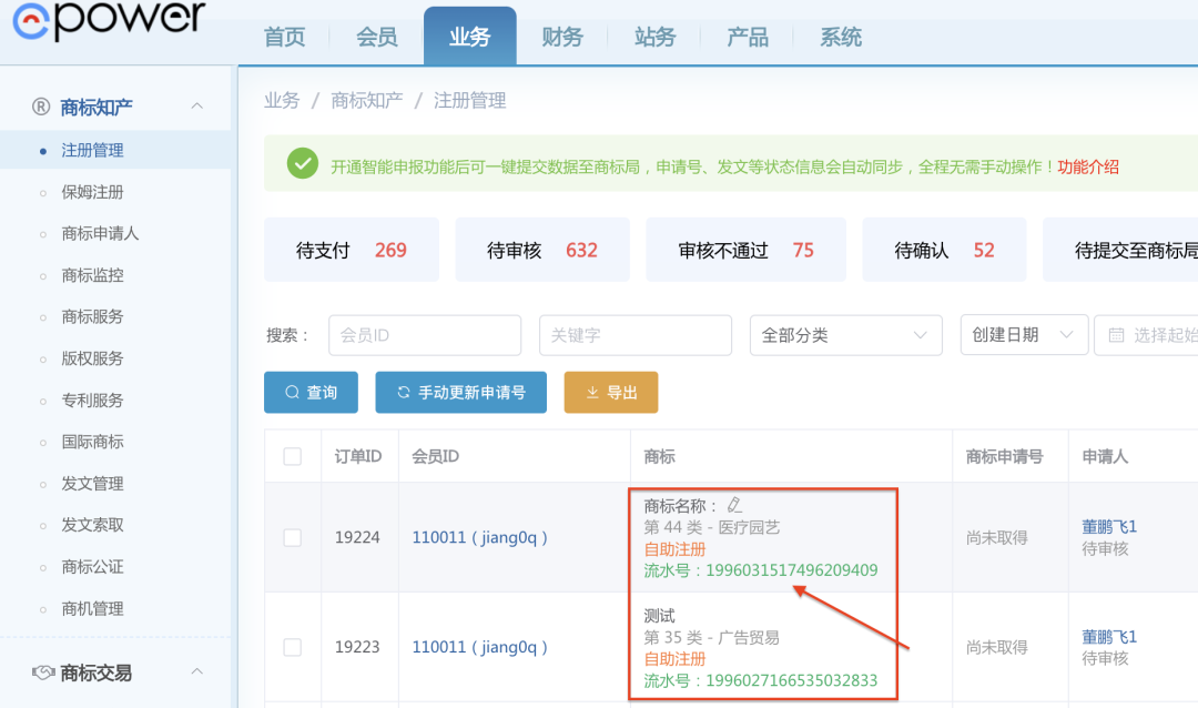 商标独立版系统在管理员后台“业务—注册管理”列表处,增加商标局流水号信息,便于管理员后期与商标局信息核对。