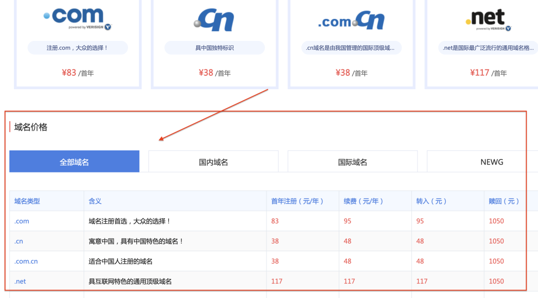 在域名服务首页增加域名价格列表,便于用户可以直观明了查看对比不同后缀域名的注册、续费、转入、赎回等价格。